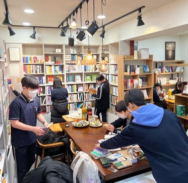 백투더북샵은 취향과 이야기를 매개로, 책·영화·사진·외국어 같은 일상의 관심사를 함께 나누며 처음 만난 사람들도 어색함 없이 대화하고, 각자의 속도로 머물다 자연스럽게 ‘같이’ 있는 시간이 만들어지도록 돕는 공간입니다.